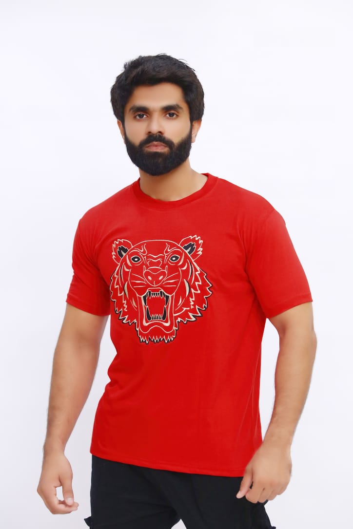 This vibrant red t-shirt features a striking large graphic of a lion's face on the front, rendered in a bold white outline. The design uses thick, jagged lines to create a fierce and powerful expression on the lion, enhancing the shirt's bold and dynamic appeal. Made from a soft, comfortable fabric, the t-shirt is designed for Premiustyle and wearability. It's a statement piece that combines a vivid color palette with a compelling graphic, making it ideal for those who want to showcase strength and confidence through their wardrobe choices.